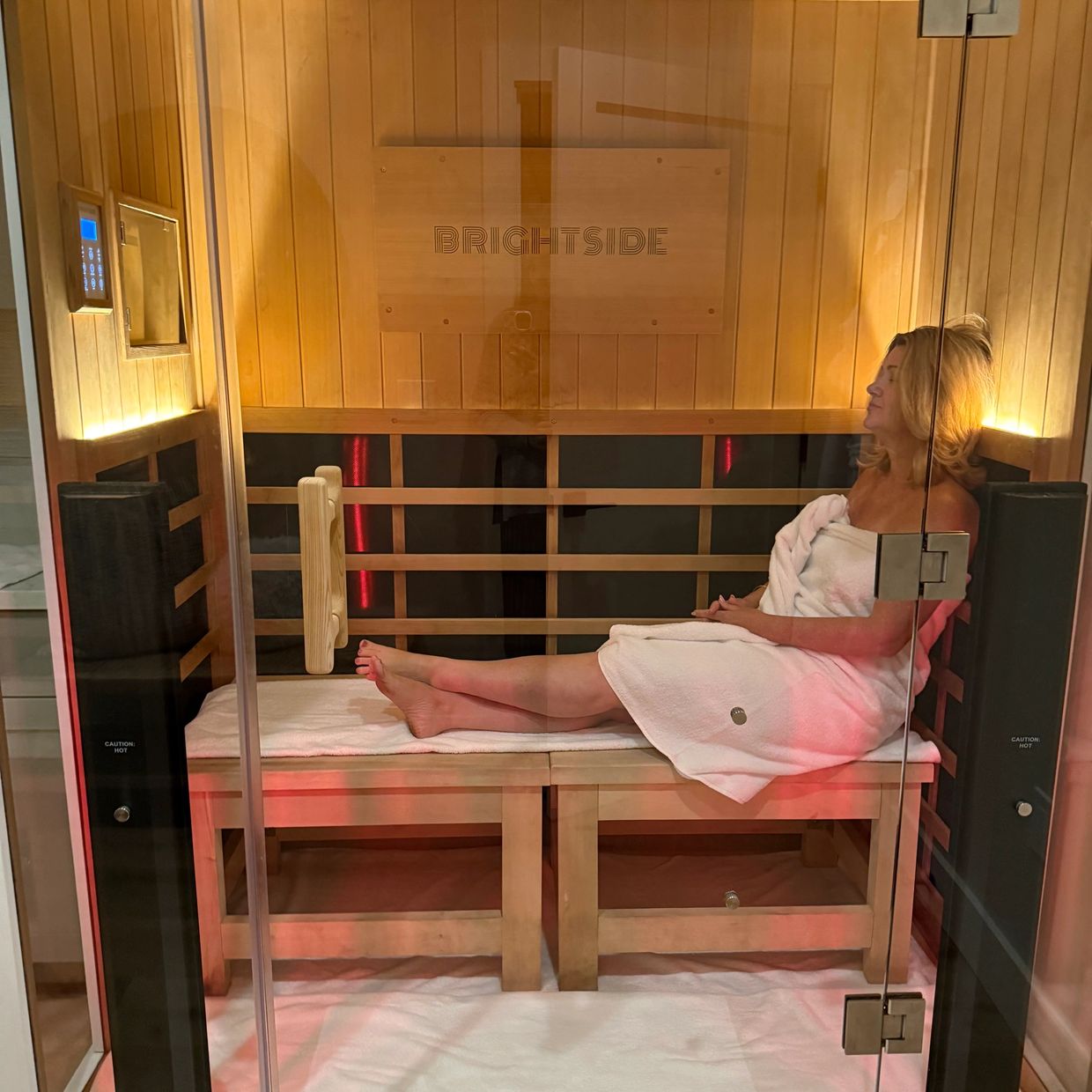 An infrared sauna uses gentle infrared light to heat the body from within rather than heating the air like a traditional steam or dry sauna. Infrared wavelengths penetrate the skin and gently elevate the body’s core temperature, promoting increased circulation, detoxification through sweating, deep relaxation, and relief of muscle tension.